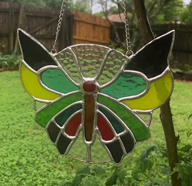 This butterfly has purple, lavender, blue, green, blue, red, yellow and blear bubble glass… it is full of color. It is approximately 7 1/2″ X 7″. It just makes you happy to look at it.