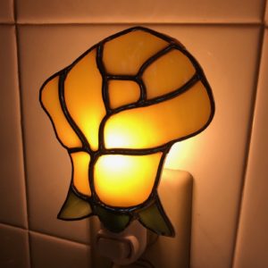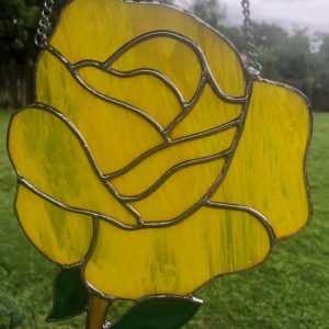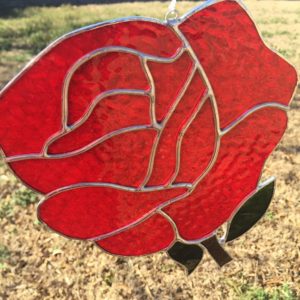 This beautiful stained glass fish is perfect for the avid fisherman… or even one that enjoys playing around with the fishing pole. It would be great in a lake house window. 10 1.2″ X 11 1/2″