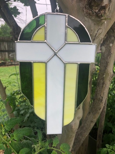 This simple but pretty cross is in stark green, yellow and white. Approximate size 6 1/2″ X 10″.