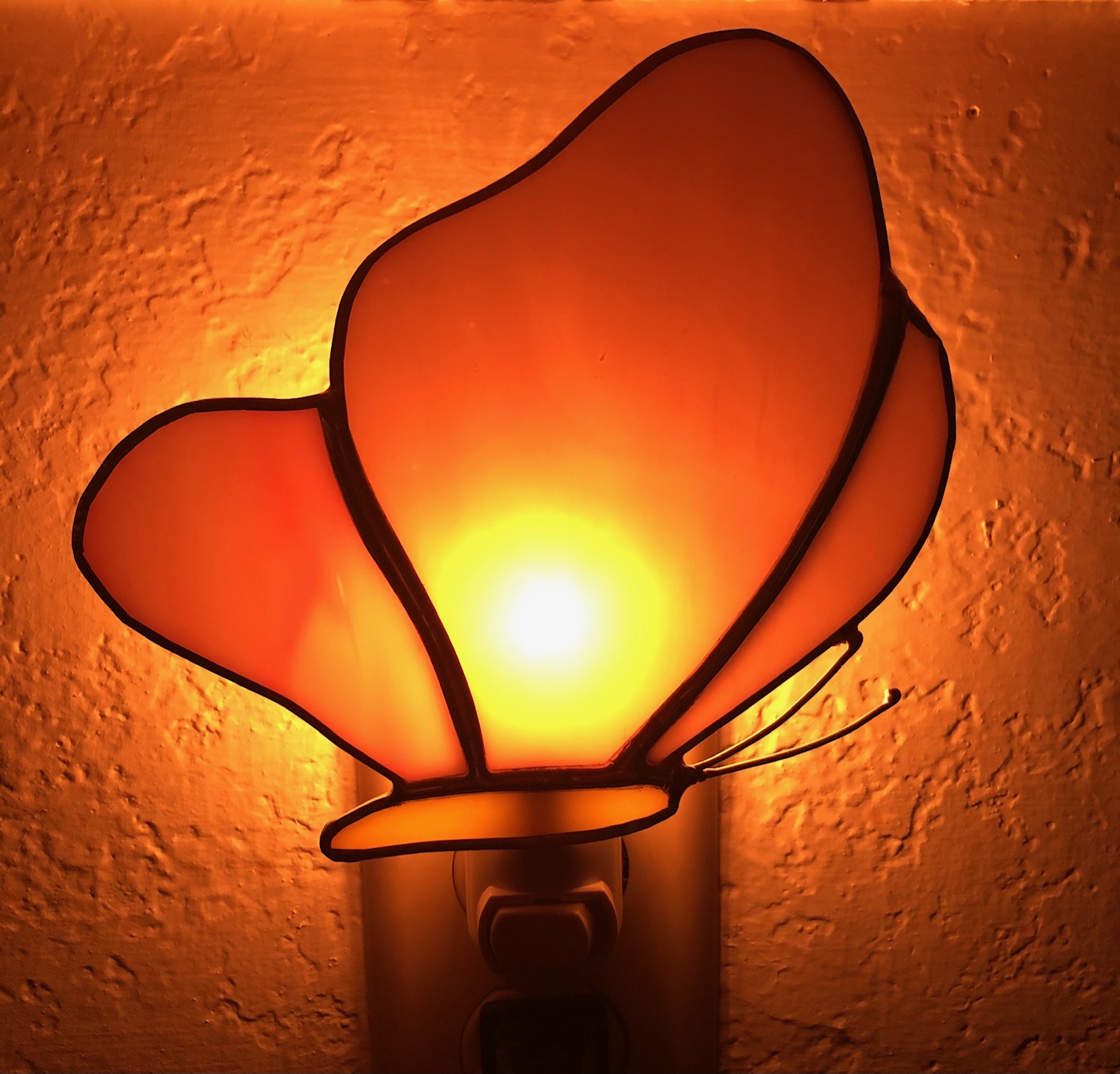 This butterfly night light sits pretty. It’s a pale pink, but any color can be done. The light shines through beautifully.
